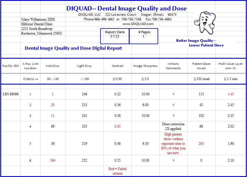 DIQUAD analyzes the digital or film image and combines the image quality, and dosimetry information into a Summary Report. The Summary Report highlights those measurements which do not pass the criteria in red. The criteria is based on a large number (over 50,000) of DIQUAD measurements and represents the 75th percentile of those measurements.